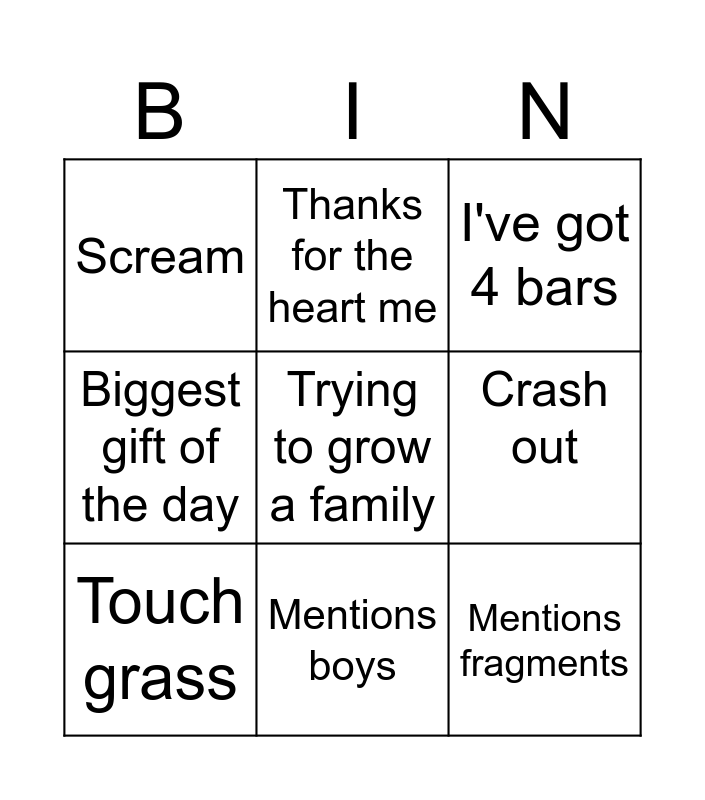 This bingo card has a free space and 8 words: Crash out, I've got 4 bars, Thanks for the heart me, Touch grass, Scream, Mentions fragments, Biggest gift of the day and Mentions boys.