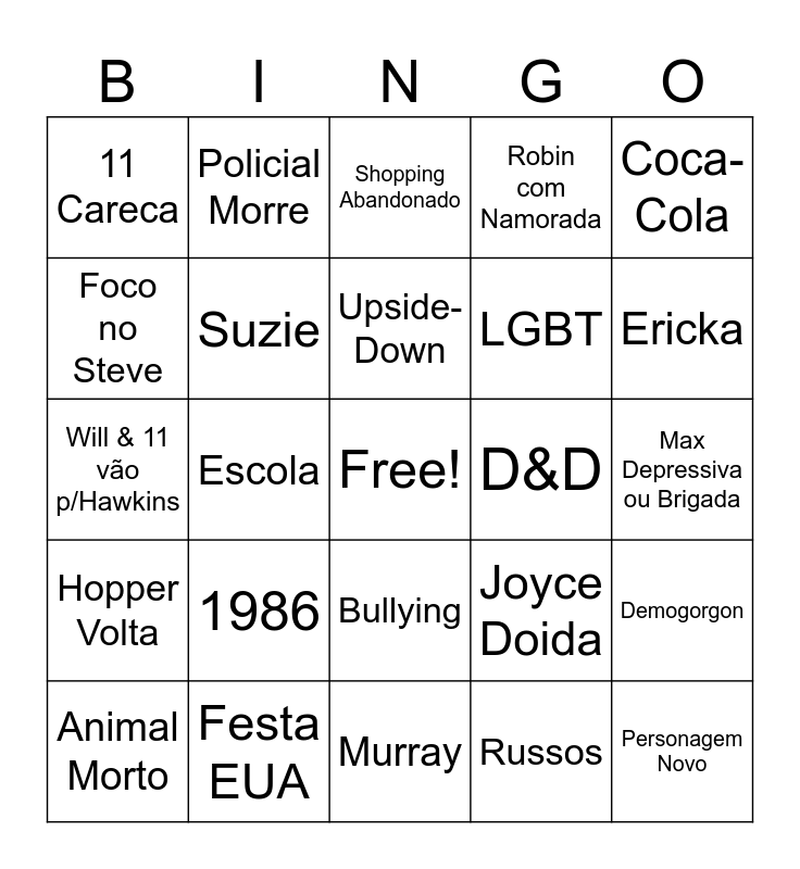 This bingo card has a free space and 24 words: 1986, Festa EUA, Upside-Down, Animal Morto, Coca-Cola, 11 Careca, Foco no Steve, Policial Morre, D&D, Bullying, LGBT, Will & 11 vão p/Hawkins, Joyce Doida, Demogorgon, Suzie, Russos, Max Depressiva ou Brigada, Shopping Abandonado, Ericka, Escola, Personagem Novo, Hopper Volta, Robin com Namorada and Murray.