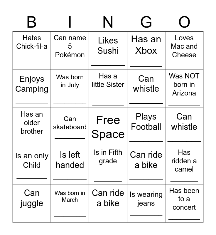 This bingo card has a free space and 34 words: Has a nickname _______, Is wearing jeans ________, Plays the piano _______, Has a Dog _______, Is an only Child _______, Was born in July _________, Loves Mac and Cheese ________, Can juggle _______, Can name 5 Pokémon _______, Hates Pizza _______, Has a little Sister ________, Likes Sushi _______, Can do taekwondo ________, Can whistle _______, Plays Football _______, Was NOT born in Arizona ________, Was born in March __________, Has an older brother _______, Is left handed _______, Can ride a bike _______, Is in Fifth grade _______, Plays soccer _______, Hates Chick-fil-a _______, Can whistle _______, Can ride a bike _______, Has been to a concert ________, Has an Xbox ______, Knows how to dance _______, Can whistle _______, Enjoys Camping _______, Has a nickname _______, Can skateboard ________, Has ridden a camel _______ and Is a morning person _______.