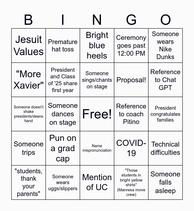 This bingo card has a free space and 36 words: Presence of a fern/white flower, President mentions her daughter, Mention of Manresa, President and Class of '25 share first year, COVID-19, Someone trips, Someone sings/chants on stage, Close up of someone crying on jumbotron, Someone wears Nike Dunks, Airhorn /noisemaker used, Someone dances on stage, Ceremony goes past 12:00 PM, "All for one, one for all", Reference to coach Pitino, Reference to Chat GPT, Jesuit Values, Mention of Brockman fire alarms, Pun on a grad cap, Someone falls asleep, Bright blue heels, President congratulates families, Technical difficulties, Someone wears uggs/slippers, "students, thank your parents", Mention of UC, Premature hat toss, Someone doesn't shake presidents/deans hand, Crowd cheers for Quincy Olivari, Proposal!, "More Xavier", Someone does a flip on stage, Mention of Senior Week Activities, "Those students in bright yellow shirts" (Manresa move crew), Name mispronunciation, 15+ people seated on stage and someone jumps/flinches at confetti.
