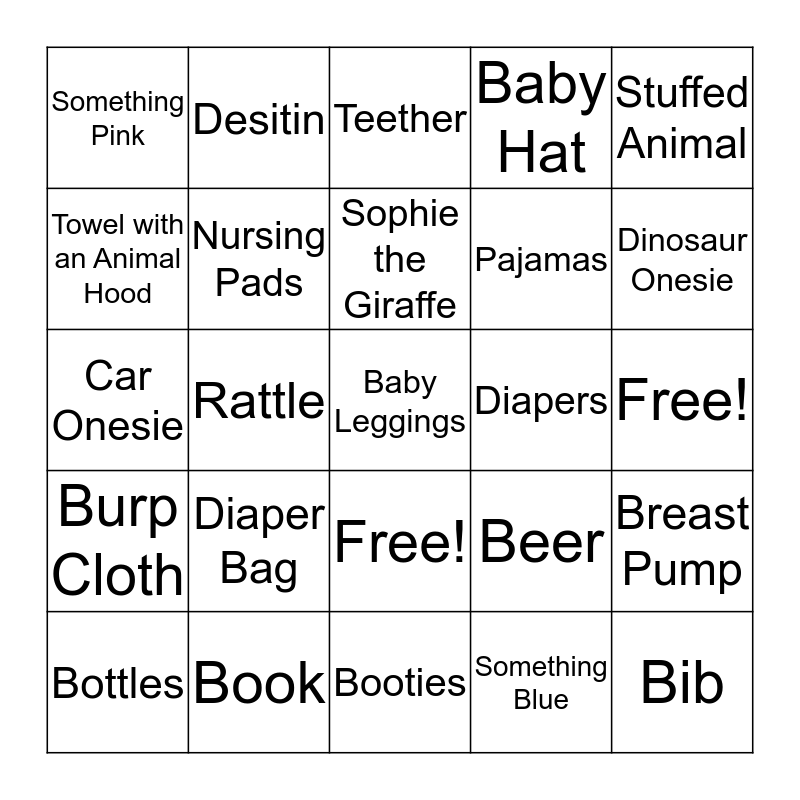 This bingo card has 26 words: Free!, Something Blue, Sophie the Giraffe, Book, Stuffed Animal, Something Pink, Towel with an Animal Hood, Desitin, Free!, Beer, Pajamas, Car Onesie, Breast Pump, Bottles, Rattle, Gift Card, Baby Hat, Burp Cloth, Teether, Baby Leggings, Dinosaur Onesie, Booties, Diapers, Diaper Bag, Nursing Pads and Bib.