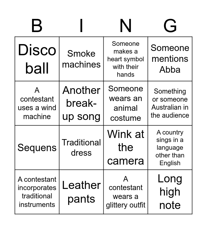 This bingo card has 27 words: Free!, Fake rain, Sequens, Rapping, Another break-up song, Someone makes a heart symbol with their hands, Smoke machines, Long high note, Leather pants, Key change, Wink at the camera, Someone mentions Abba, Blows a kiss at the camera, Face painted as a flag, Traditional dress, Song in native language, Someone wears an animal costume, Something or someone Australian in the audience, Camera pans 360°, Disco ball, A contestant wears a glittery outfit, A song about peace or unity, A country sings in a language other than English, A contestant incorporates traditional instruments, costume change mid-performance, A contestant uses a wind machine and A song with a political statement.