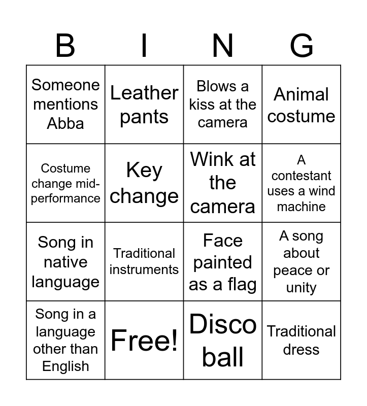 This bingo card has 22 words: Free!, Long high note, Leather pants, Out of tune singing, Key change, Wink at the camera, Someone mentions Abba, Blows a kiss at the camera, Face painted as a flag, Traditional dress, Song in native language, Animal costume, Something or someone Australian in the audience, Camera pans 360°, Disco ball, Glittery outfit, A song about peace or unity, Song in a language other than English, Traditional instruments, Costume change mid-performance, A contestant uses a wind machine and A song with a political statement.