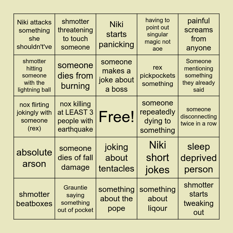 This bingo card has a free space and 30 words: something about Niki's avatar, Grauntie saying something out of pocket, Niki starts panicking, Chan starts screaming, painful screams from anyone, Niki attacks something she shouldn't've, someone dies from burning, someone makes a joke about a boss, rex pickpockets something, shmotter starts tweaking out, shmotter beatboxes, someone dies of fall damage, something about liqour, someone starts saying gibberish in panic, absolute arson, shmotter taunts something, something about the pope, someone repeatedly dying to something, sleep deprived person, shmotter hitting someone with the lightning ball, nox killing at LEAST 3 people with earthquake, multiple people dying not to the boss but aoe magic, having to point out singular magic not aoe, someone disconnecting twice in a row, nox flirting jokingly with someone (rex), shmotter threatening to touch someone, joking about tentacles, Niki short jokes, Someone mentioning something they already said and Jiggle physics pointed out.