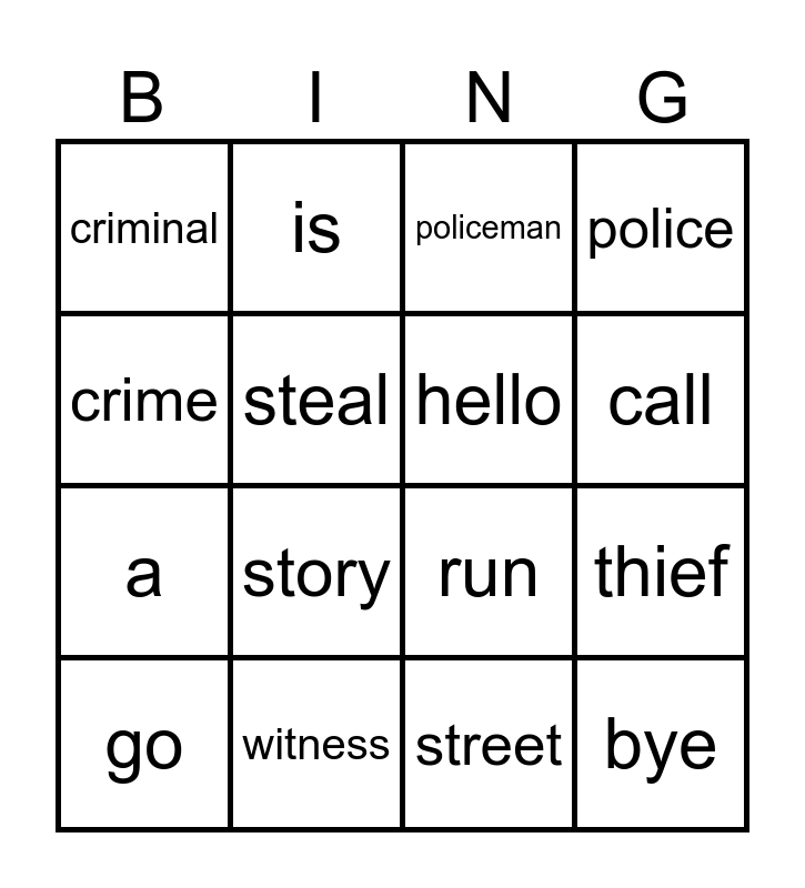 This bingo card has 16 words: witness, thief, policeman, criminal, a, is, run, street, crime, steal, go, police, story, call, hello and bye.