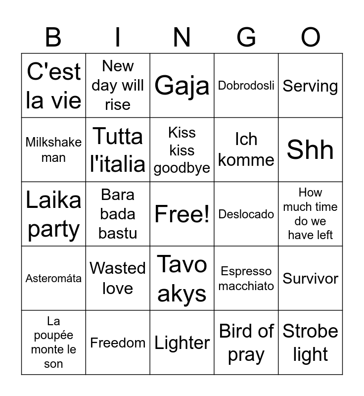 This bingo card has a free space and 31 words: Lighter, Zjem, Bara bada bastu, Róa, C'est la vie, Gaja, Tutta l'italia, Espresso macchiato, Deslocado, Bird of pray, How much time do we have left, Strobe light, Run with u, Poison cake, Shh, Bur man laimi, Survivor, Wasted love, Asteromáta, Tavo akys, Serving, Hallucination, La poupée monte le son, New day will rise, Ich komme, Milkshake man, Dobrodosli, Laika party, Freedom, Kiss kiss goodbye and Mila.