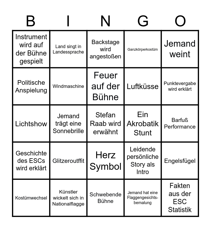 This bingo card has 25 words: Glitzeroutffit, Schwebende Bühne, Feuer auf der Bühne, Kostümwechsel, Jemand weint, Instrument wird auf der Bühne gespielt, Politische Anspielung, Land singt in Landessprache, Ein Akrobatik Stunt, Herz Symbol, Luftküsse, Lichtshow, Leidende persönliche Story als Intro, Engelsfügel, Windmaschine, Fakten aus der ESC Statistik, Barfuß Performance, Backstage wird angestoßen, Punktevergabe wird erklärt, Jemand trägt eine Sonnebrille, Stefan Raab wird erwähnt, Künstler wickelt sich in Nationalflagge, Geschichte des ESCs wird erklärt, Ganzkörperkostüm and Jemand hat eine Flaggengesichts-bemalung.