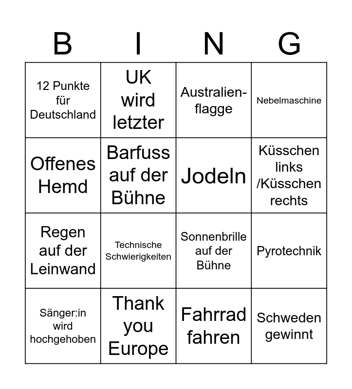This bingo card has 16 words: Sänger:in wird hochgehoben, Thank you Europe, Australien-flagge, Nebelmaschine, Offenes Hemd, UK wird letzter, Sonnenbrille auf der Bühne, Pyrotechnik, 12 Punkte für Deutschland, Barfuss auf der Bühne, Fahrrad fahren, Küsschen links /Küsschen rechts, Regen auf der Leinwand, Technische Schwierigkeiten, Jodeln and Schweden gewinnt.