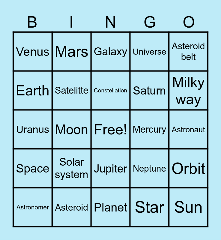 This bingo card has a free space and 24 words: Solar system, Asteroid, Constellation, Astronomer, Asteroid belt, Venus, Earth, Mars, Mercury, Jupiter, Saturn, Uranus, Neptune, Orbit, Satelitte, Star, Astronaut, Galaxy, Milky way, Moon, Sun, Space, Universe and Planet.