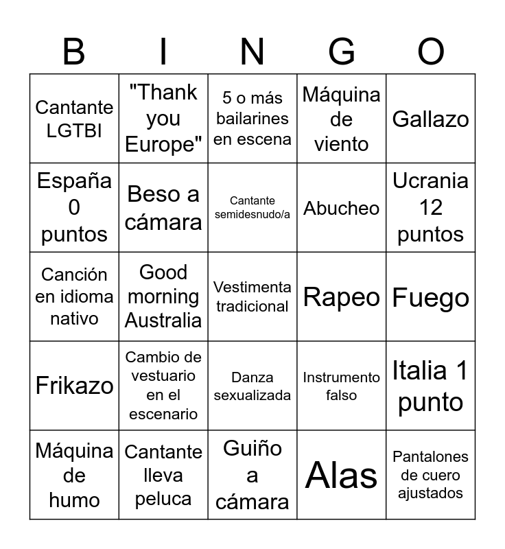 This bingo card has a free space and 24 words: Cambio de vestuario en el escenario, Cantante lleva peluca, Cantante semidesnudo/a, Máquina de humo, Gallazo, Cantante LGTBI, España 0 puntos, "Thank you Europe", Rapeo, Danza sexualizada, Abucheo, Canción en idioma nativo, Instrumento falso, Italia 1 punto, Beso a cámara, Alas, Fuego, 5 o más bailarines en escena, Ucrania 12 puntos, Good morning Australia, Pantalones de cuero ajustados, Frikazo, Máquina de viento and Guiño a cámara.