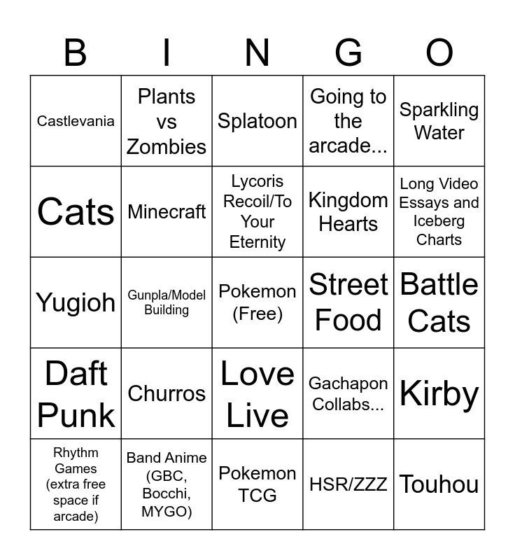 This bingo card has a free space and 24 words: Rhythm Games (extra free space if arcade), Churros, Lycoris Recoil/To Your Eternity, HSR/ZZZ, Sparkling Water, Castlevania, Plants vs Zombies, Splatoon, Street Food, Battle Cats, Yugioh, Minecraft, Gachapon Collabs..., Kirby, Cats, Band Anime (GBC, Bocchi, MYGO), Pokemon TCG, Going to the arcade..., Long Video Essays and Iceberg Charts, Daft Punk, Gunpla/Model Building, Love Live, Kingdom Hearts and Touhou.