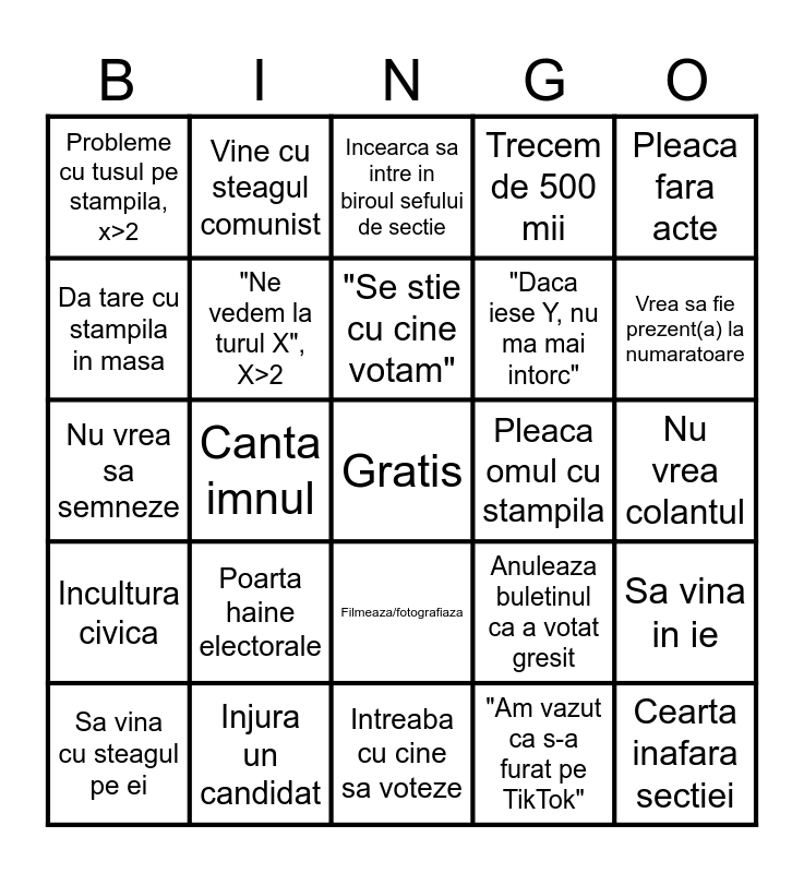 This bingo card has a free space and 30 words: Injura un candidat, Multumeste operatorilor, Canta imnul, Vine cu acte expirate sau fara, Probleme cu tusul pe stampila, x>2, Incearca sa intre in biroul sefului de sectie, "Ne vedem la turul X", X>2, Filmeaza/fotografiaza, Pleaca omul cu stampila, Intreaba cu cine sa voteze, Nu vrea colantul, Cearta inafara sectiei, "Am vazut ca s-a furat pe TikTok", Banc cu homosexuali, Vrea sa fie prezent(a) la numaratoare, Si-a trecut singur candidatul, Anuleaza buletinul ca a votat gresit, Incultura civica, Poarta haine electorale, Pleaca fara acte, Nu vrea sa semneze, Vin cu dovada de de resedinta, Vine cu steagul comunist, "Daca iese Y, nu ma mai intorc", Da tare cu stampila in masa, Trecem de 500 mii, Sa vina in ie, Sa vina cu steagul pe ei, "Se stie cu cine votam" and "Nu mi-ai dat sticker/stampila".