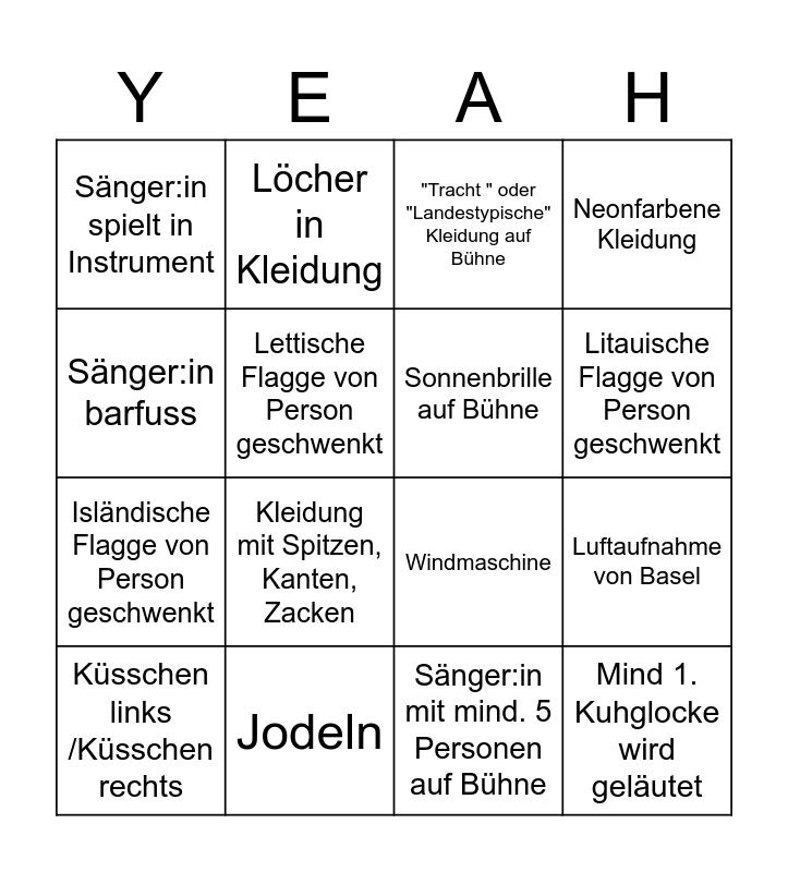 This bingo card has 44 words: Deutschland wird letzter, Küsschen links /Küsschen rechts, Gesicht in Landesfarben angemalt, Nicht interviewte Person schreit ins Mikro, Thank you Europe, Albanische Flagge von Person geschwenkt, "Tracht " oder "Landestypische" Kleidung auf Bühne, Offenes Hemd, Sänger:in barfuss, Pyrotechnik, Neonfarbene Kleidung, Jodeln, Regen auf Leinwand, Herzgeste mit Fingern, Sänger:in wird hochgehoben, Wardrobe malfunktion, Nebelmaschine, Windmaschine, Technische Schwierigkeiten, Kleidung mit Spitzen, Kanten, Zacken, Löcher in Kleidung, Kleiderwechsel auf Bühne, Kusshand in Kamera, Sänger:in spielt in Instrument, Sänger:in auf Knien, Sänger:in mit mind. 5 Personen auf Bühne, Sänger:in allein auf Bühne, Sänger:in singt weder in Landessprache noch auf Englisch (nicht ganzes Lied), Sänger:in ist "in ihrem Heimatland ein Star", Mind 1. Kuhglocke wird geläutet, Schokolade wird gegessen / gemacht, Typisch Schweizer Produkt wird erwähnt, mehrere Kühe, Schwitzer-dütsch wird geredet, Luftaufnahme von Basel, Alphorn wird gespielt, Deutschland 12 Punkte, Schweden gewinnt, Litauische Flagge von Person geschwenkt, Lettische Flagge von Person geschwenkt, Isländische Flagge von Person geschwenkt, Fahrrad fahren, Sonnenbrille auf Bühne and Sänger:in blickt /zeigt in Kamera.