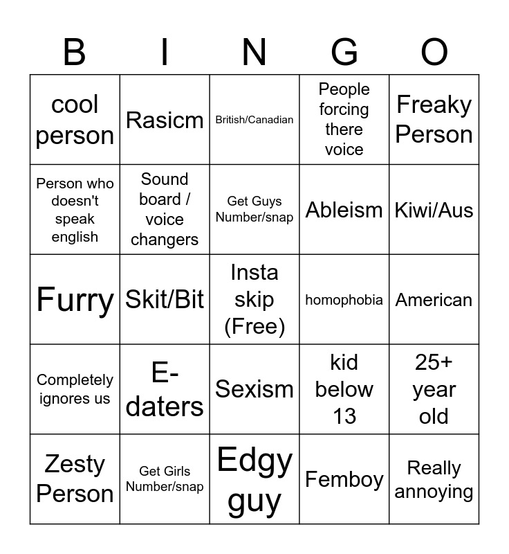 This bingo card has a free space and 24 words: E-daters, Get Girls Number/snap, Get Guys Number/snap, Zesty Person, Freaky Person, cool person, Person who doesn't speak english, Rasicm, homophobia, Sexism, Ableism, Furry, kid below 13, 25+ year old, Sound board / voice changers, Femboy, American, British/Canadian, Kiwi/Aus, Skit/Bit, Really annoying, Completely ignores us, People forcing there voice and Edgy guy.