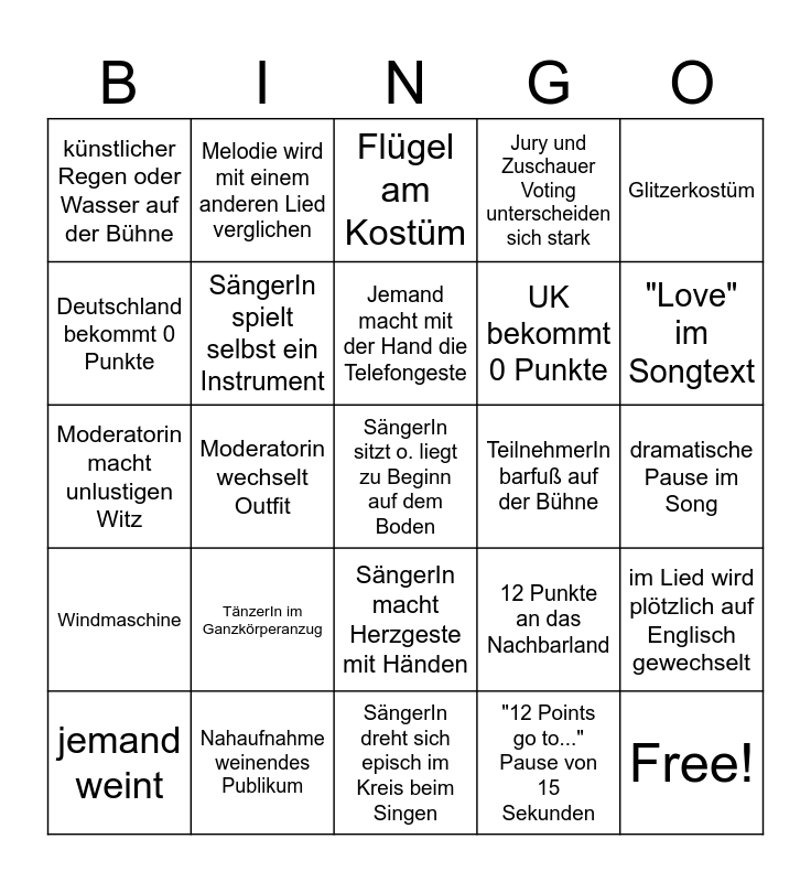This bingo card has 33 words: Free!, Thank you Europe, Moderatorin wechselt Outfit, Nebelmaschine, Windmaschine, SängerIn spielt selbst ein Instrument, Glitzerkostüm, jemand weint, Melodie wird mit einem anderen Lied verglichen, SängerIn wechselt während des Auftritts das Kostüm, Jemand macht mit der Hand die Telefongeste, Flügel am Kostüm, unnötig großes Feuer, Opern Gesang, TeilnehmerIn barfuß auf der Bühne, "Love" im Songtext, Nahaufnahme weinendes Publikum, Moderatorin macht unlustigen Witz, TänzerIn im Ganzkörperanzug, 12 Punkte an das Nachbarland, SängerIn macht Herzgeste mit Händen, "Europe" fällt im Voting mindestens 3x hintereinander, künstlicher Regen oder Wasser auf der Bühne, dramatische Pause im Song, SängerIn dreht sich episch im Kreis beim Singen, SängerIn sitzt o. liegt zu Beginn auf dem Boden, Jury und Zuschauer Voting unterscheiden sich stark, UK bekommt 0 Punkte, Deutschland bekommt 0 Punkte, im Lied wird plötzlich auf Englisch gewechselt, Outfit sieht aus wie ein DIY-Projekt von Lady Gaga, "12 Points go to..." Pause von 15 Sekunden and Live-Übersetzer überfordert. Improvisiert komplett..