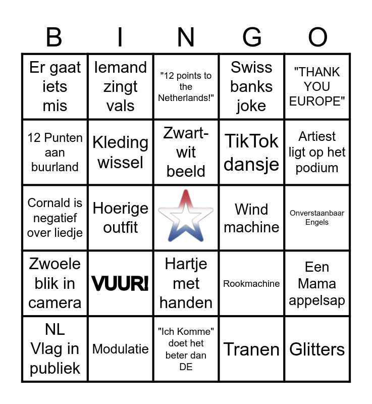 This bingo card has a free space and 24 words: VUUR!, Modulatie, Zwart-wit beeld, NL Vlag in publiek, "THANK YOU EUROPE", Er gaat iets mis, 12 Punten aan buurland, Iemand zingt vals, Wind machine, Hartje met handen, TikTok dansje, Cornald is negatief over liedje, Rookmachine, Een Mama appelsap, Kleding wissel, Tranen, Onverstaanbaar Engels, "12 points to the Netherlands!", Artiest ligt op het podium, Hoerige outfit, Glitters, Zwoele blik in camera, Swiss banks joke and "Ich Komme" doet het beter dan DE.