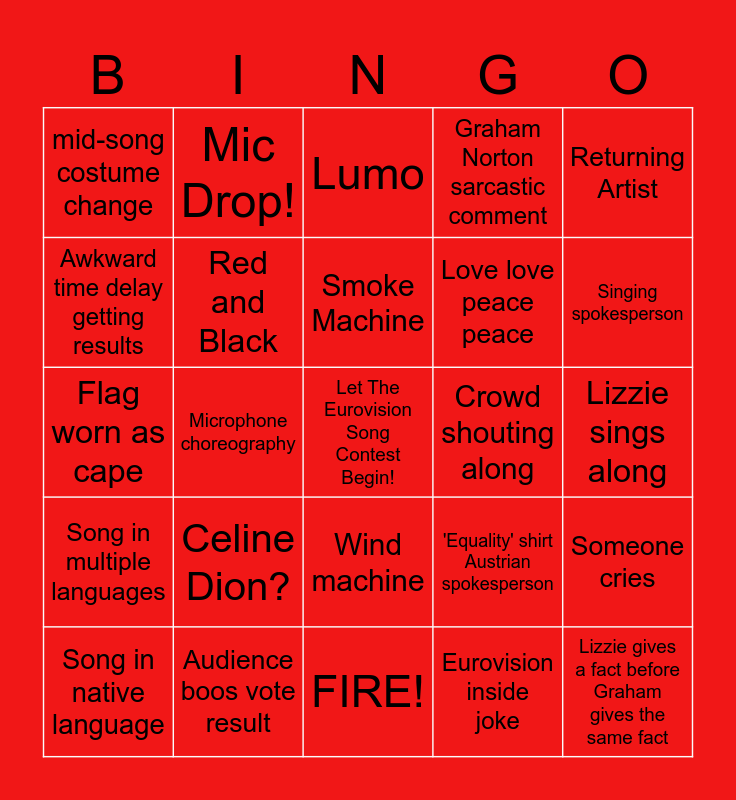 This bingo card has a free space and 39 words: 69th Eurovision joke, Finland give Sweden 12 points, Letvitating/flying, Red and Black, Song in native language, Wind machine, Smoke Machine, Key change!!!, Returning Artist, Song in multiple languages, Microphone choreography, Graham Norton sarcastic comment, Lizzie gives a fact before Graham gives the same fact, Lizzie sings along, Crowd shouting along, Celine Dion?, Hosts change outfits, mid-song costume change, Shirtless man, 'Equality' shirt Austrian spokesperson, Awkward time delay getting results, FIRE!, Love love peace peace, Singing spokesperson, Dance break!, Thank you Europe!, Eiffel Tower appears on screen, Something goes wrong, Violin, Mic Drop!, Someone wearing a hat, Cringey joke from hosts, Lumo, Audience boos vote result, Eurovision inside joke, Fake instrument playing, Someone cries, Flag worn as cape and Super long note.