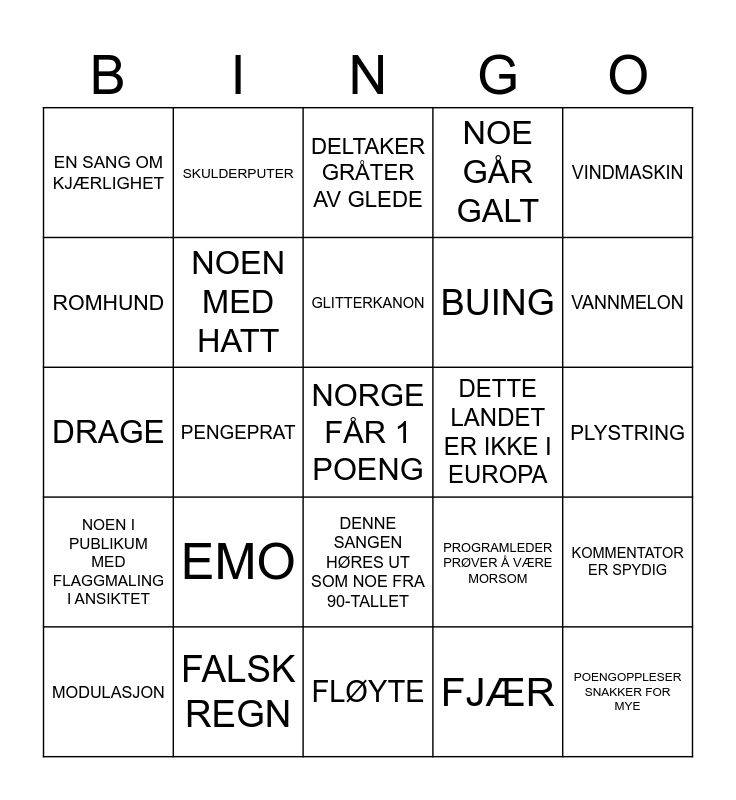 This bingo card has 59 words: Free!, FALSK REGN, SYNKRONISERT DANS, NOEN I PUBLIKUM MED FLAGGMALING I ANSIKTET, FJÆR, PROGRAMLEDER BYTTER ANTREKK, NOEN MED HATT, TAKKER VERTSLANDET FOR "A WONDERFUL EVENING", BUING, SYNGER FALSKT, NOE GÅR GALT, ILD, ROMHUND, KOSTYMEBYTTE MIDT I SANGEN, PØLSE, EN SANG OM KJÆRLIGHET, NORGE FÅR 1 POENG, VINDMASKIN, KLAPPING I SANGEN, GLITTERKANON, DETTE LANDET ER IKKE I EUROPA, DELTAKER GRÅTER AV GLEDE, MODULASJON, KOMMENTATOR ER SPYDIG, EN SANG OM Å SLÅ OPP, ÅPENBART FALSK INSTRUMENTSPILLING, PALJETTER, TRADISJONELT ANTREKK, VANNMELON, BLUNKER TIL KAMERA, KLEIN TIDSFORSINKELSE, NORGE FÅR 12 POENG, EN SANG OM FRED, ÅPENBART POLITISK STEMMING, SKULDERPUTER, NORGE FÅR MER ENN 50 POENG FRA FOLKESTEMMER, NOEN RAPPER, PENGEPRAT, 12 POENG TIL ET NABOLAND, DRAGE, KUNSTMUSEUM, EMO, PLYSTRING, PROGRAMLEDER SLITER MED Å FYLLE TIDEN, SKINNANTREKK, DISCOKULE, HAR PROGRAMLEDEREN GÅTT OFF-SCRIPT?, NULL POENG, DENNE SANGEN HØRES UT SOM NOE FRA 90-TALLET, FLØYTE, SOLBRILLER INNENDØRS, VINGER, ENTRÉ FRA TAKET ELLER GULVET, DELTAKER LIGGER PÅ SCENEN, SANGEN BYGGER SEG OPP TIL INGENTING, PROGRAMLEDER PRØVER Å VÆRE MORSOM, "AND NOW, A VERY SPECIAL SURPRISE…", POENGOPPLESER SNAKKER FOR MYE and DETTE KOMMER TIL Å BLI EN MEME.