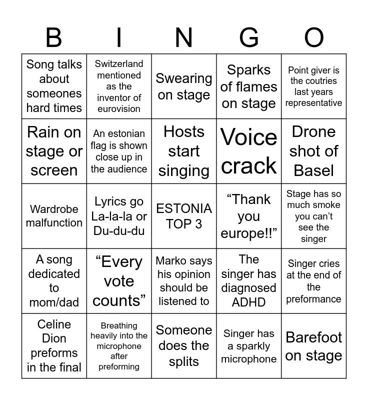 This bingo card has a free space and 24 words: “Every vote counts”, Breathing heavily into the microphone after preforming, Hosts start singing, Celine Dion preforms in the final, Point giver is the coutries last years representative, Song talks about someones hard times, Rain on stage or screen, Switzerland mentioned as the inventor of eurovision, “Thank you europe!!”, Marko says his opinion should be listened to, Voice crack, Wardrobe malfunction, The singer has diagnosed ADHD, Singer cries at the end of the preformance, An estonian flag is shown close up in the audience, Singer has a sparkly microphone, Stage has so much smoke you can’t see the singer, Swearing on stage, Drone shot of Basel, Lyrics go La-la-la or Du-du-du, Barefoot on stage, A song dedicated to mom/dad, Sparks of flames on stage and Someone does the splits.