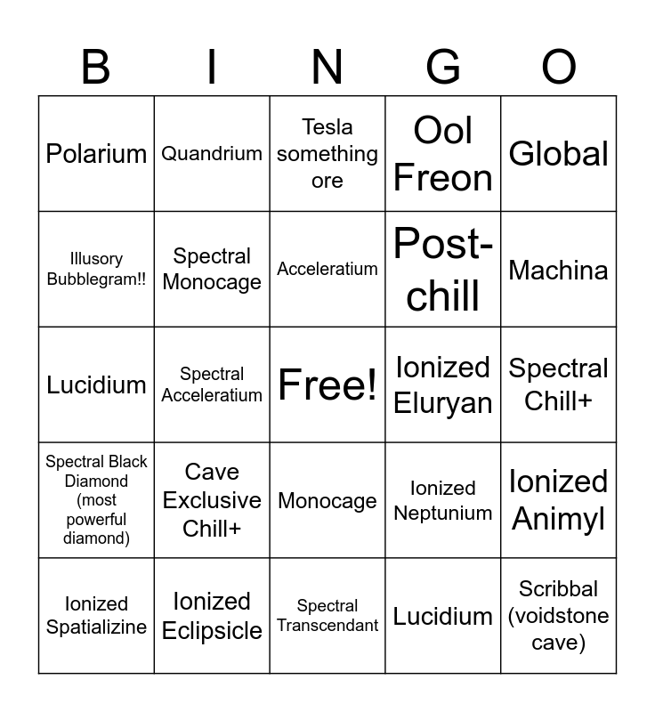 This bingo card has a free space and 24 words: Ionized Spatializine, Cave Exclusive Chill+, Acceleratium, Lucidium, Global, Polarium, Quandrium, Tesla something ore, Ionized Eluryan, Spectral Chill+, Lucidium, Spectral Monocage, Ionized Neptunium, Ionized Animyl, Illusory Bubblegram!!, Ionized Eclipsicle, Spectral Transcendant, Ool Freon, Machina, Spectral Black Diamond (most powerful diamond), Spectral Acceleratium, Monocage, Post-chill and Scribbal (voidstone cave).