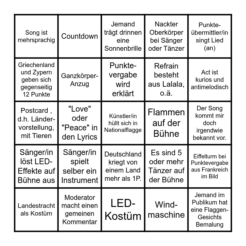 This bingo card has 50 words: Moderator/in hat sich umgezogen, Künstler/in hüllt sich in Nationalflagge, Traditionelles Kostüm / Tracht, LED-Kostüm, Sänger/in spielt selber ein Instrument, Kleidungsstück ändert sich während des Auftritts, Countdown, Handherzen für die Zuschauer, Griechenland und Zypern geben sich gegenseitig 12 Punkte, Nebel auf der Bühne, Ganzkörper- Anzug, Nackter Oberkörper bei Sänger oder Tänzer, Eiffelturm bei Punktevergabe aus Frankreich im Bild, Es sind 5 oder mehr Tänzer auf der Bühne, "Europe, stop voting now", Telefongeste in die Kamera, Punkte-vergabe wird erklärt, Flammen auf der Bühne, Act selbst oder die Eltern standen beim ESC schon auf der Bühne, Punkte-übermittler/in singt Lied (an), "Love" oder "Peace" in den Lyrics, Wind-maschine, Song ist mehrsprachig, Refrain besteht aus Lalala, o.ä., Akrobatik auf der Bühne, Jemand im Publikum hat eine Flaggen- Gesichts Bemalung, Act ist kurios und antimelodisch, Dem Gastgeber wird für den Abend gedankt, Jemand trägt drinnen eine Sonnenbrille, Deutschland kriegt von einem Land mehr als 1P., Im Greenroom wird angestoßen, "Good Evening Europe good morning Australia", Sänger/in ist Barfuß, Jemand sagt „Grand Prix“, Moderator macht einen gemeinen Kommentar, 12 Punkte für Deutschland, Outfit aus Lack und Leder, Duett, Konfetti-Regen, Der Song kommt mir doch irgendwie bekannt vor., Goldregen, Overknees, "You're good to go", Die Halle singt laut hörbar mit, Landestracht als Kostüm, Postcard , d.h. Länder-vorstellung, mit Tieren, lange künstliche Fingernägel, Sänger/in steht auf Podest oder ähnlichem, Sänger/in löst LED-Effekte auf Bühne aus and wie aus einem Horrorfilm.