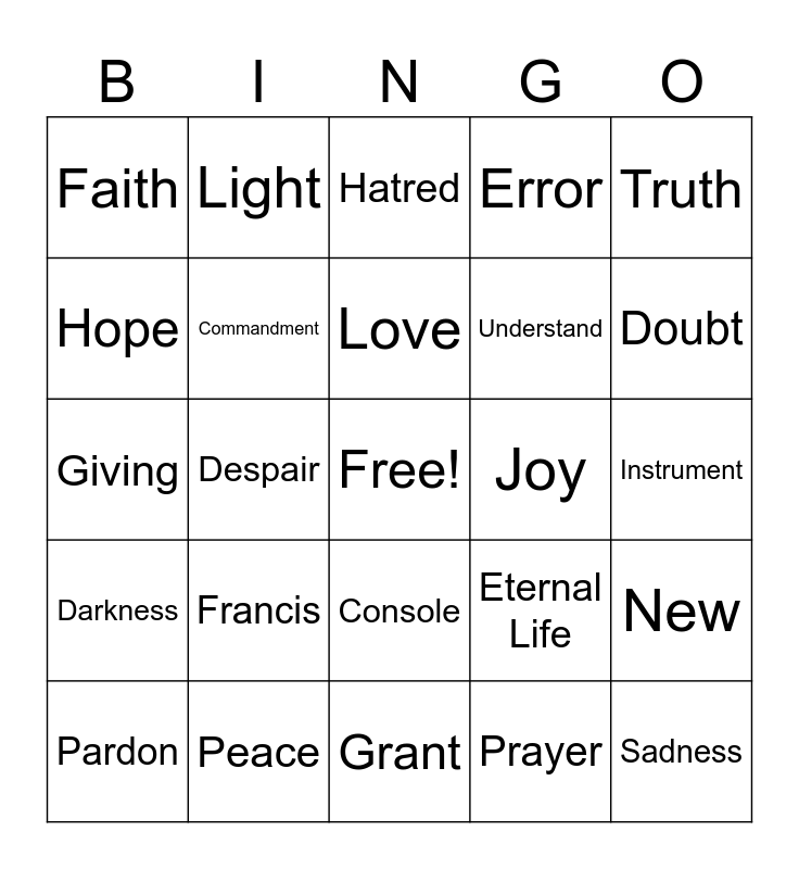 This bingo card has a free space and 24 words: Francis, Peace, Love, Pardon, Truth, Faith, Hope, Light, Joy, Console, Understand, Giving, Eternal Life, New, Commandment, Prayer, Instrument, Hatred, Doubt, Despair, Sadness, Darkness, Error and Grant.