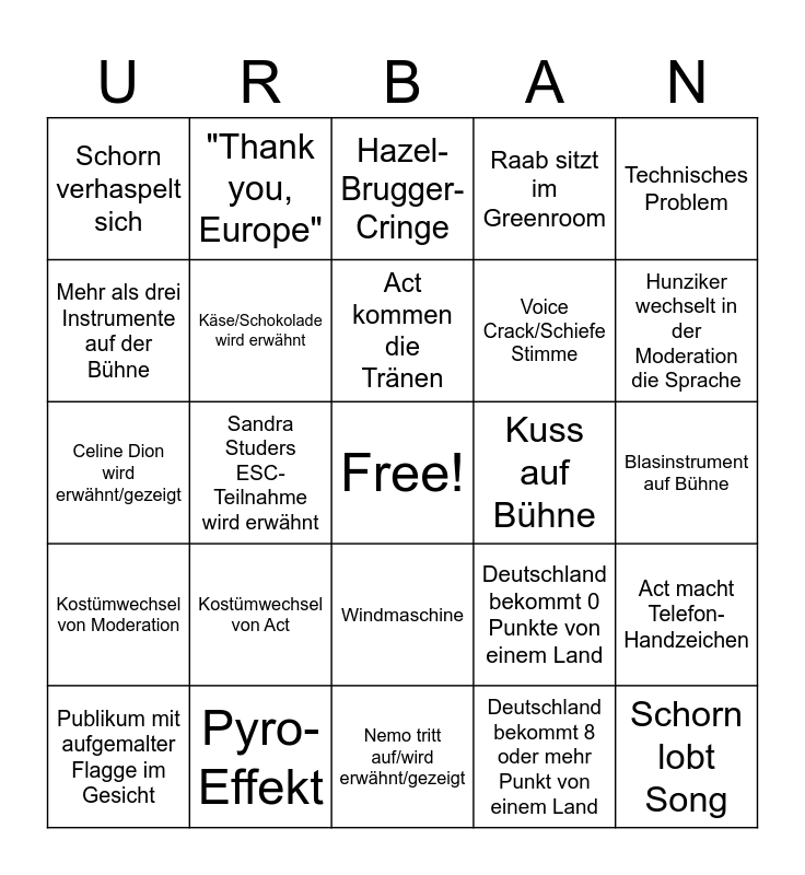 This bingo card has a free space and 24 words: Kostümwechsel von Act, Pyro-Effekt, Act kommen die Tränen, Publikum mit aufgemalter Flagge im Gesicht, Technisches Problem, Schorn verhaspelt sich, Mehr als drei Instrumente auf der Bühne, "Thank you, Europe", Kuss auf Bühne, Windmaschine, Voice Crack/Schiefe Stimme, Celine Dion wird erwähnt/gezeigt, Deutschland bekommt 0 Punkte von einem Land, Act macht Telefon-Handzeichen, Käse/Schokolade wird erwähnt, Deutschland bekommt 8 oder mehr Punkt von einem Land, Blasinstrument auf Bühne, Hazel-Brugger-Cringe, Hunziker wechselt in der Moderation die Sprache, Sandra Studers ESC-Teilnahme wird erwähnt, Schorn lobt Song, Kostümwechsel von Moderation, Raab sitzt im Greenroom and Nemo tritt auf/wird erwähnt/gezeigt.