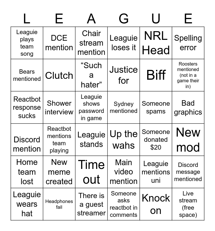 This bingo card has 42 words: Knock on, Clutch, Someone muted, Someone spams, New mod, Reactbot mentions team playing, Reactbot response sucks, New clip, Chair stream mention, Bad graphics, Leaguie shows password in game, Justice for, Roosters mentioned (not in a game their in), NRL Head, Headphones fail, Discord mention, Discord message mentioned, Biff, Live stream (free space), DCE mention, Spelling error, Time out, Home team lost, Leaguie plays team song, His potential, Leaguie wears hat, “Such a hater”, Giveaway, New meme created, Leaguie mentions uni, Canberra mentioned, Sydney mentioned, Bears mentioned, Someone donated $20, There is a guest streamer, Leaguie stands, Up the wahs, Shower interview, Main video mention, Someone asks reactbot in comments, Leaguie loses it and penalty In the first 10.