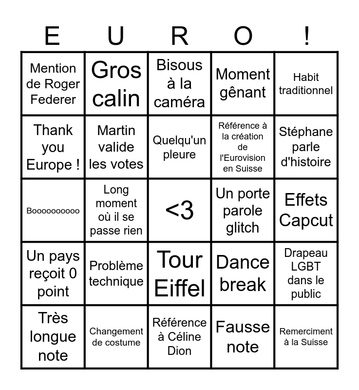 This bingo card has a free space and 27 words: Dance break, Drapeau de la Palestine dans le public, Référence à la création de l'Eurovision en Suisse, Référence à Céline Dion, Thank you Europe !, Bisous à la caméra, Gros calin, Un pays reçoit 0 point, Un porte parole glitch, Drapeau LGBT dans le public, Boooooooooo, Moment gênant, Très longue note, Changement de costume, Stéphane parle d'histoire, Laurence aime beaucoup un gars, Martin valide les votes, Quelqu'un pleure, Problème technique, Mention de Roger Federer, Effets Capcut, Fausse note, Long moment où il se passe rien, Remerciment à la Suisse, Tour Eiffel, Habit traditionnel and 12 points à son voisin.