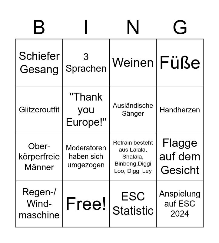 This bingo card has 16 words: Free!, Flagge auf dem Gesicht, Weinen, Schiefer Gesang, Ober- körperfreie Männer, 3 Sprachen, Refrain besteht aus Lalala, Shalala, Binbong,Diggi Loo, Diggi Ley, ESC Statistic, Glitzeroutfit, "Thank you Europe!", Regen-/ Wind- maschine, Füße, Moderatoren haben sich umgezogen, Handherzen, Ausländische Sänger and Anspielung auf ESC 2024.