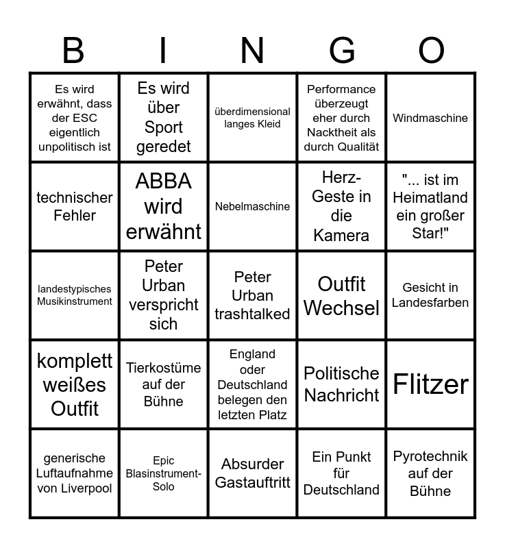 This bingo card has 35 words: Es wird zum 3. Mal erwähnt, dass Peter Urban aufhört, Song, in dem mindestens zwei Sprachen vorkommen, Urban sagt etwas sexistisches oder rassistisches, ABBA wird erwähnt, England oder Deutschland belegen den letzten Platz, Performance überzeugt eher durch Nacktheit als durch Qualität, technischer Fehler, Jemand macht eine Telefongeste in die Kamera, Nebelmaschine, Spanien überzeugt eher durch Nacktheit als durch Qualität, landestypisches Musikinstrument, Windmaschine, Jemand ist barfuß, Lord of the Lost wird mit Maneskin verglichen, Es wird erwähnt, dass der ESC eigentlich unpolitisch ist, Outfit Wechsel, Ein Punkt für Deutschland, Peter Urban verspricht sich, komplett weißes Outfit, Peter Urban trashtalked, Politische Nachricht, generische Luftaufnahme von Liverpool, Flitzer, Epic Blasinstrument-Solo, überdimensional langes Kleid, "... ist im Heimatland ein großer Star!", Pyrotechnik auf der Bühne, 12 Punkte für Deutschland, Herz-Geste in die Kamera, Gesicht in Landesfarben, Es wird eine Burg gezeigt, Absurder Gastauftritt, Tierkostüme auf der Bühne, Es wird über Sport geredet and Es wird erklärt, warum Australien teilnimmt.