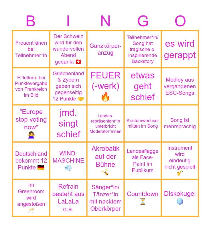This bingo card has 25 words: WIND- MASCHINE 💨, Sänger*in/ Tänzer*in mit nacktem Oberkörper, FEUER (-werk) 🔥, Im Greenroom wird angestoßen 🥂, es wird gerappt, Freuentränen bei Teilnehmer*in, Eiffelturm bei Punktevergabe von Frankreich im Bild, Der Schweiz wird für den wundervollen Abend gedankt 🇨🇭, Kostümwechsel mitten im Song, Akrobatik auf der Bühne 🤸, etwas geht schief, "Europe stop voting now" 🙅♀️, Landesflagge als Face-Paint im Publikum, Instrument wird eindeutig nicht gespielt 🎷, Griechenland & Zypern geben sich gegenseitig 12 Punkte 🤝, Diskokugel 🪩, Song ist mehrsprachig, Ganzkörper-anzug, Medley aus vergangenen ESC-Songs, jmd. singt schief, Landes- repräsentant*in unterbricht Moderator*innen, Refrain besteht aus LaLaLa o.ä., Deutschland bekommt 12 Punkte 🇩🇪, Teilnehmer*in/ Song hat tragische o. inspirierende Backstory and Countdown ⏳.