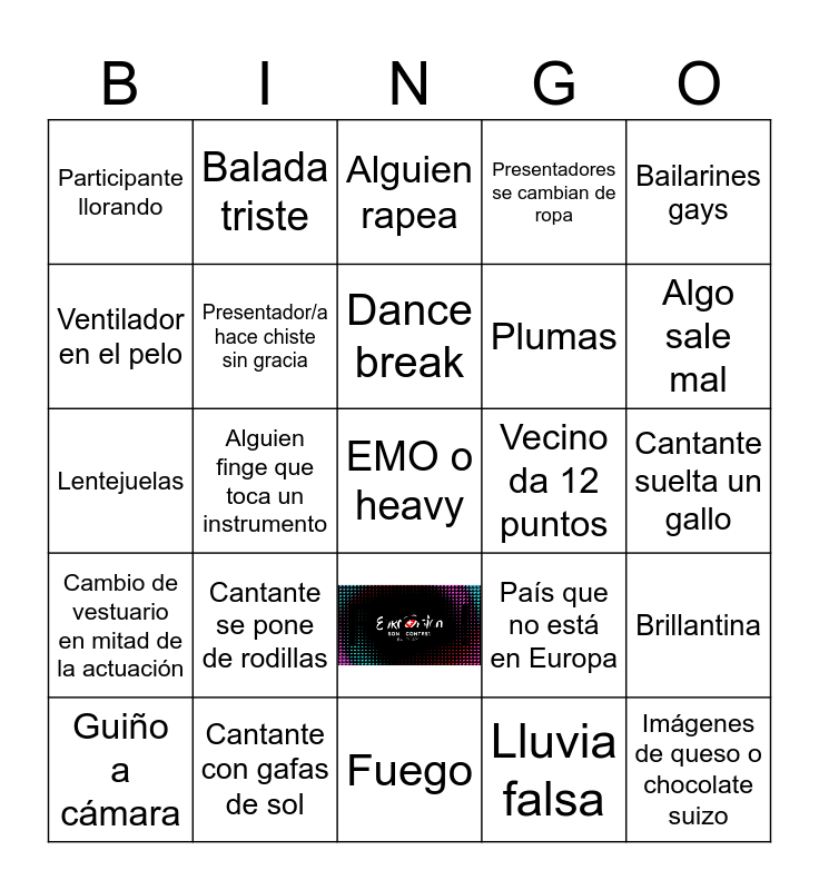 This bingo card has 1 images and 26 words: Free!, Lluvia falsa, Dance break, Cantante con gafas de sol, Bailarines gays, Participante llorando, Ventilador en el pelo, Balada triste, Cantante suelta un gallo, País que no está en Europa, Plumas, Lentejuelas, Brillantina, Guiño a cámara, Alguien finge que toca un instrumento, Hombreras, Presentadores se cambian de ropa, Cambio de vestuario en mitad de la actuación, Alguien rapea, EMO o heavy, Algo sale mal, Fuego, Vecino da 12 puntos, Cantante se pone de rodillas, Presentador/a hace chiste sin gracia and Imágenes de queso o chocolate suizo.