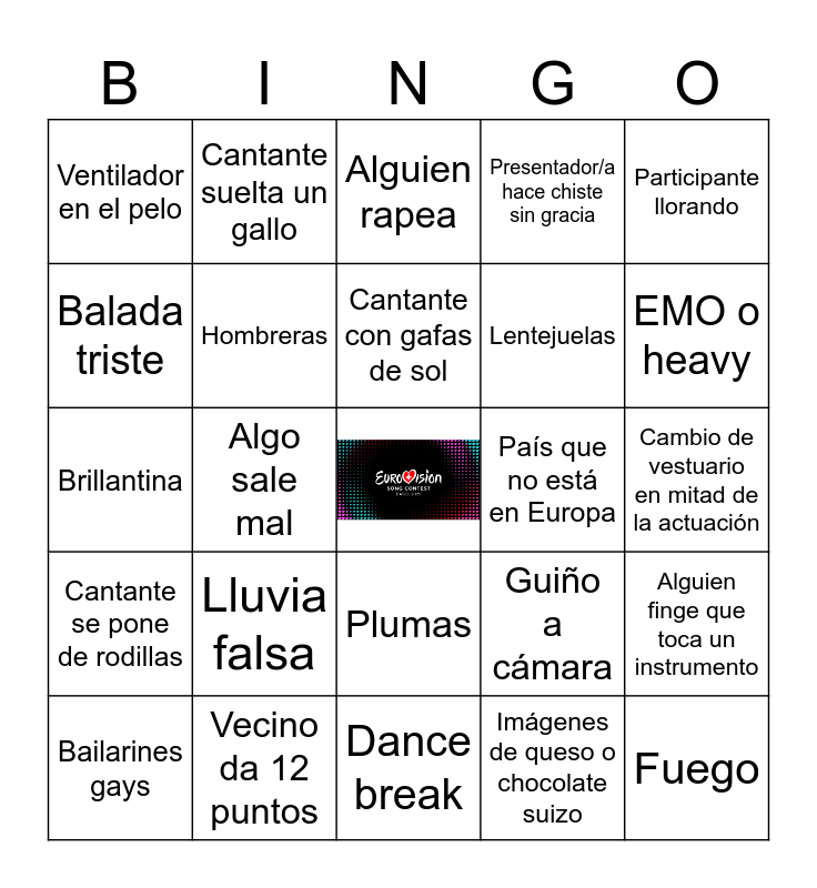 This bingo card has a free space and 25 words: Lluvia falsa, Dance break, Cantante con gafas de sol, Bailarines gays, Participante llorando, Ventilador en el pelo, Balada triste, Cantante suelta un gallo, País que no está en Europa, Plumas, Lentejuelas, Brillantina, Guiño a cámara, Alguien finge que toca un instrumento, Hombreras, Presentadores se cambian de ropa, Cambio de vestuario en mitad de la actuación, Alguien rapea, EMO o heavy, Algo sale mal, Fuego, Vecino da 12 puntos, Cantante se pone de rodillas, Presentador/a hace chiste sin gracia and Imágenes de queso o chocolate suizo.
