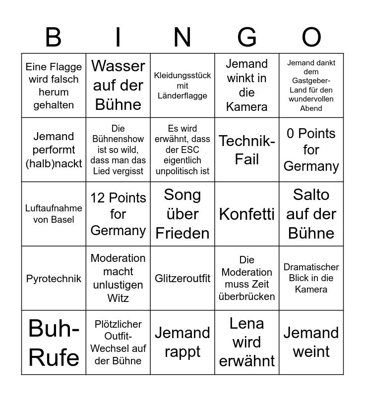 This bingo card has 25 words: Moderation macht unlustigen Witz, Jemand rappt, Es wird erwähnt, dass der ESC eigentlich unpolitisch ist, Buh-Rufe, Jemand dankt dem Gastgeber-Land für den wundervollen Abend, Eine Flagge wird falsch herum gehalten, Jemand performt (halb)nackt, Wasser auf der Bühne, Konfetti, Glitzeroutfit, Technik-Fail, Luftaufnahme von Basel, Die Moderation muss Zeit überbrücken, Dramatischer Blick in die Kamera, Die Bühnenshow ist so wild, dass man das Lied vergisst, Jemand weint, Salto auf der Bühne, Kleidungsstück mit Länderflagge, 0 Points for Germany, 12 Points for Germany, Song über Frieden, Plötzlicher Outfit-Wechsel auf der Bühne, Pyrotechnik, Jemand winkt in die Kamera and Lena wird erwähnt.