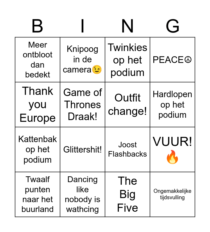 This bingo card has 33 words: Free!, Presentatoren veranderen outfit, VUUR!🔥, Wind machine, Ongemakkelijke tijdsvulling, Outfit change!, Thank you Europe, Claude!!!!, Knipoog in de camera😉, RAP BREAK, Hardlopen op het podium, Twinkies op het podium, Twinkies in het publiek, Regenboog vlaggetjes, Dancing like nobody is wathcing, Glittershit!, Douze Points🌟, Joost Flashbacks, Meeklappen, Iemand loopt voor het beeld langs, Valse noot, Eyefucking de camera, Meer ontbloot dan bedekt, The Big Five, Nederlandse Vlag, Twaalf punten naar het buurland, PEACE☮, Kattenbak op het podium, Game of Thrones Draak!, Liggen op het podium, Cornald Maas in beeld, Celine Dion!😏~ and Valse noot🎵.