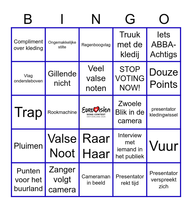 This bingo card has a free space and 37 words: Glitter, Vuurwerk, Discobal, Gillende nicht, Vuur, Valse Noot, Veel valse noten, "good evening Europe", Iets ABBA-Achtigs, Windmachine, Rookmachine, Truuk met de kledij, Presentator verspreekt zich, presentator kledingwissel, Vlag ondersteboven, Pluimen, Bloot bovenlijf, Regenboogvlag, Raar Haar, Zwoele Blik in de camera, Compliment over kleding, Douze Points, Punten voor het buurland, Cameraman in beeld, Presentator spreekt Frans, Presentator rekt tijd, Ongemakkelijke stilte, Flauwe grap, Palestijnse vlag, Oproep tot vrede, Lasers, Zanger volgt camera, Trap, Volksdans, Interview met iemand in het publiek, STOP VOTING NOW! and Artiest in tranen.