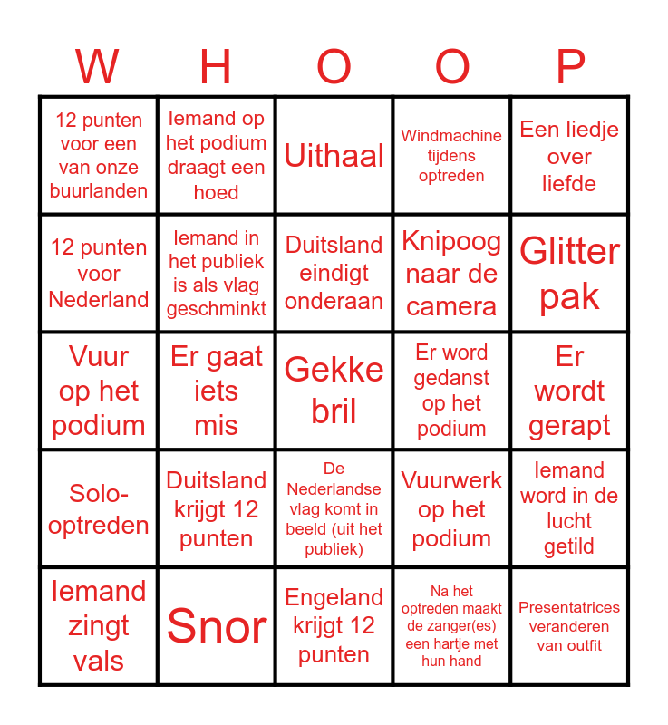 This bingo card has 25 words: Duitsland krijgt 12 punten, Engeland krijgt 12 punten, Duitsland eindigt onderaan, Iemand zingt vals, Een liedje over liefde, 12 punten voor een van onze buurlanden, 12 punten voor Nederland, Iemand op het podium draagt een hoed, Er word gedanst op het podium, De Nederlandse vlag komt in beeld (uit het publiek), Knipoog naar de camera, Vuur op het podium, Vuurwerk op het podium, Iemand word in de lucht getild, Iemand in het publiek is als vlag geschminkt, Presentatrices veranderen van outfit, Er wordt gerapt, Uithaal, Glitter pak, Er gaat iets mis, Gekke bril, Snor, Solo-optreden, Windmachine tijdens optreden and Na het optreden maakt de zanger(es) een hartje met hun hand.