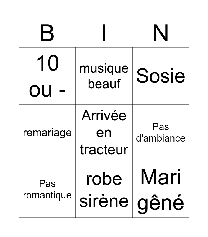 This bingo card has a free space and 8 words: Pas d'ambiance, Sosie, musique beauf, Pas romantique, 10 ou -, Mari gêné, remariage and robe sirène.