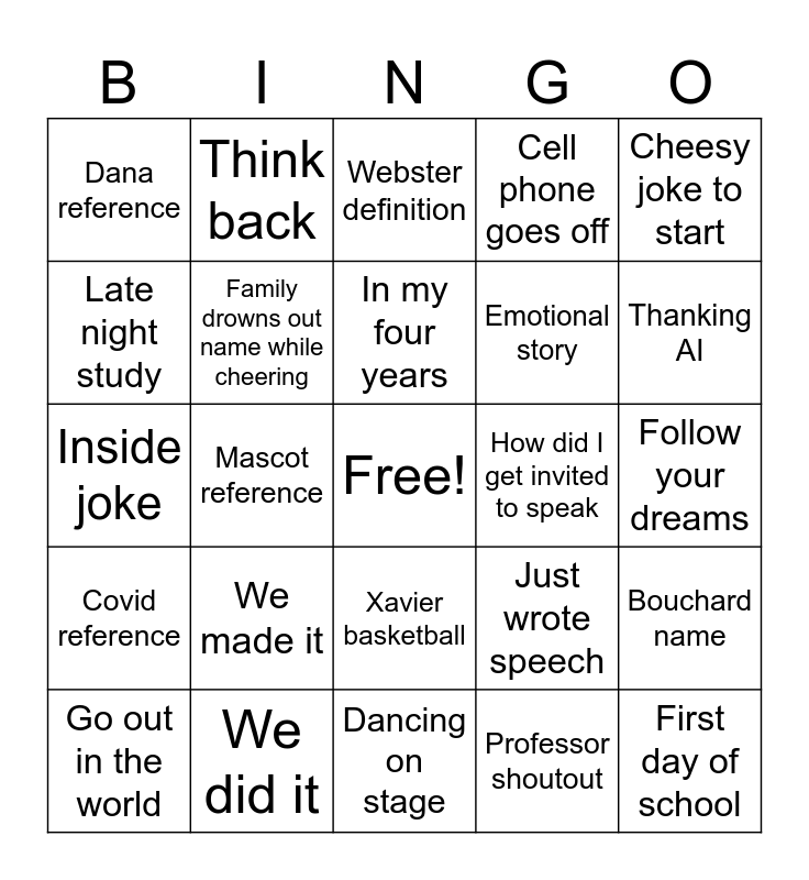 This bingo card has a free space and 24 words: We made it, We did it, In my four years, Go out in the world, Cheesy joke to start, Dana reference, Late night study, Think back, How did I get invited to speak, Xavier basketball, Emotional story, Inside joke, Just wrote speech, Bouchard name, Family drowns out name while cheering, Professor shoutout, Follow your dreams, Webster definition, Thanking AI, Mascot reference, First day of school, Covid reference, Cell phone goes off and Dancing on stage.