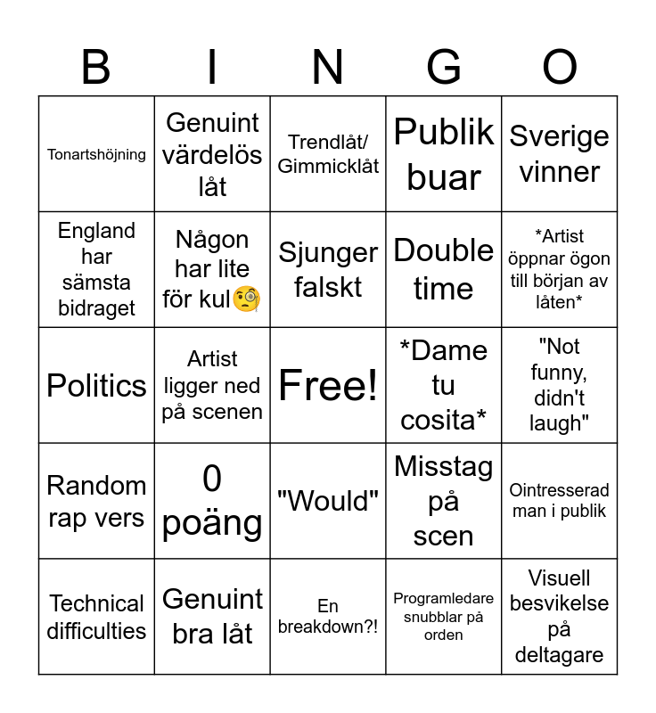 This bingo card has a free space and 24 words: 0 poäng, Genuint bra låt, Sjunger falskt, Technical difficulties, Sverige vinner, Tonartshöjning, England har sämsta bidraget, Genuint värdelös låt, *Dame tu cosita*, "Would", Double time, Politics, Misstag på scen, Ointresserad man i publik, Någon har lite för kul🧐, Programledare snubblar på orden, "Not funny, didn't laugh", Trendlåt/ Gimmicklåt, *Artist öppnar ögon till början av låten*, Artist ligger ned på scenen, Visuell besvikelse på deltagare, Random rap vers, Publik buar and En breakdown?!.