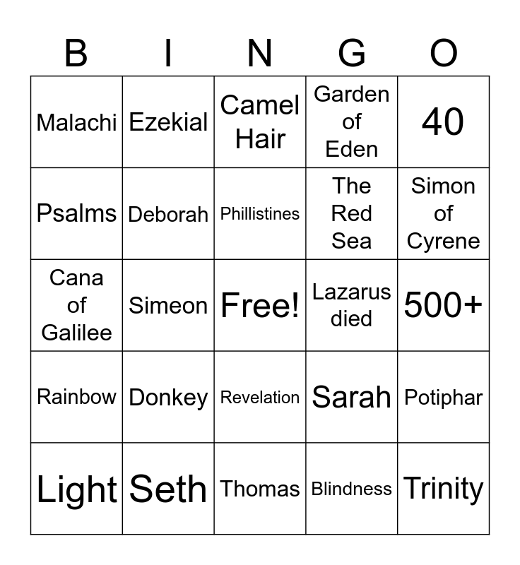 This bingo card has a free space and 75 words: 10, A Ghost, Camel Hair, Coat of Many Colors, Esther, Gabriel, Gopher, Jericho, Jordan, Locusts, Manna, No, Phillistines, Psalms, River, Simeon, Tax Collector, Trinity, 1, 40, Abraham, Cana of Galilee, Deborah, Ezekial, Garden of Eden, Gospels, Jerusalem, Joseph of Arimethea, Love, Matthew, Parables, Pilate, Rahab, Sarah, Simon of Cyrene, The Red Sea, Wisdom, 8, 500+, Blindness, Ciaphas, Elijah and Moses, Fishing, God, Hebrew, Jonah, Light, Malachi, Nebuchadnezzer, Peter, Priest, Revelation, Shepherd, Stephen, Thorns, TRUE, 4, 66, Bethlehem, Carpenter, Donkey, Famine, Gethsemane, Greek, John the Baptist, Lazarus died, Luke, Mt. Sinai, Paul, Potiphar, Rainbow, Seth, Solomon, Thomas and FALSE.