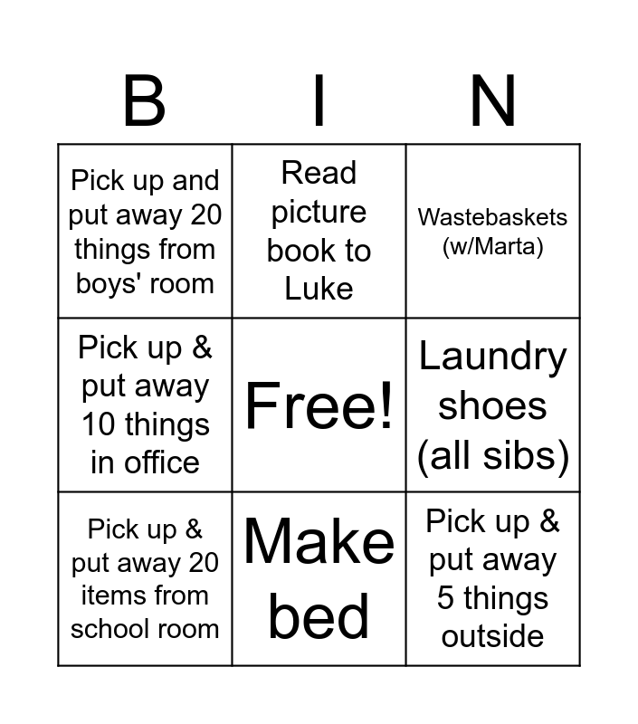 This bingo card has a free space and 8 words: Laundry shoes (all sibs), Wastebaskets (w/Marta), Read picture book to Luke, Pick up & put away 20 items from school room, Pick up and put away 20 things from boys' room, Pick up & put away 5 things outside, Pick up & put away 10 things in office and Make bed.