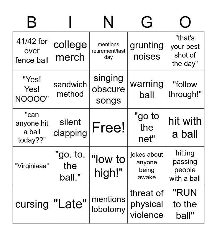 This bingo card has a free space and 24 words: "go. to. the ball.", "Late", singing obscure songs, cursing, "that's your best shot of the day", 41/42 for over fence ball, "Yes! Yes! NOOOO", college merch, "go to the net", "low to high!", warning ball, "can anyone hit a ball today??", jokes about anyone being awake, hitting passing people with a ball, sandwich method, threat of physical violence, hit with a ball, mentions retirement/last day, "follow through!", silent clapping, "RUN to the ball", "Virginiaaa", grunting noises and mentions lobotomy.