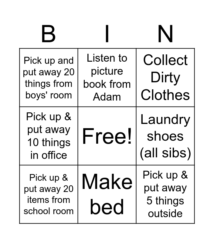This bingo card has a free space and 8 words: Laundry shoes (all sibs), Collect Dirty Clothes, Listen to picture book from Adam, Pick up & put away 20 items from school room, Pick up and put away 20 things from boys' room, Pick up & put away 5 things outside, Pick up & put away 10 things in office and Make bed.