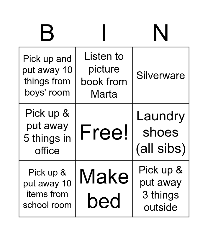 This bingo card has a free space and 8 words: Laundry shoes (all sibs), Silverware, Listen to picture book from Marta, Pick up & put away 10 items from school room, Pick up and put away 10 things from boys' room, Pick up & put away 3 things outside, Pick up & put away 5 things in office and Make bed.