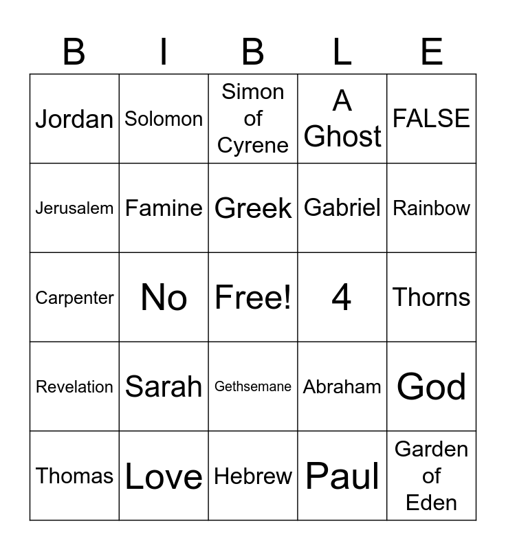 This bingo card has a free space and 75 words: Phillistines, Trinity, Simon of Cyrene, Camel Hair, 40, Simeon, The Red Sea, Jonah, Lazarus died, Parables, Priest, TRUE, Greek, Jerusalem, 8, No, Deborah, Garden of Eden, 500+, FALSE, Gopher, Carpenter, Famine, Solomon, A Ghost, Matthew, Pilate, River, Tax Collector, Joseph of Arimethea, Rahab, Peter, 10, Abraham, Rainbow, Gabriel, Manna, 1, Thorns, Paul, Blindness, Stephen, Bethlehem, Luke, Locusts, Ezekial, Thomas, Jordan, Psalms, Cana of Galilee, 66, Gethsemane, Fishing, Malachi, John the Baptist, Donkey, Esther, Ciaphas, Nebuchadnezzer, Gospels, Sarah, Elijah and Moses, Shepherd, Seth, Coat of Many Colors, 4, Mt. Sinai, Potiphar, Jericho, God, Revelation, Love, Wisdom, Hebrew and Light.