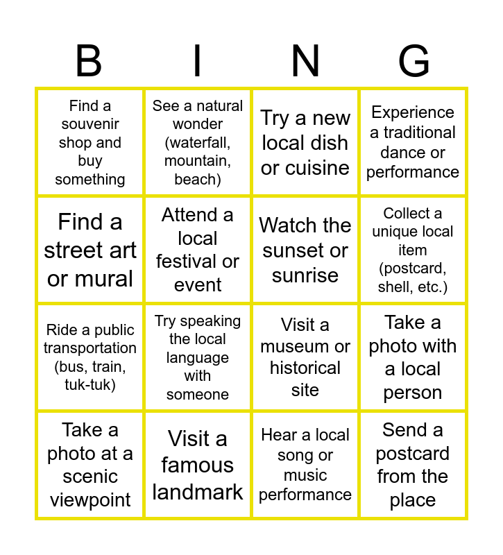 This bingo card has 16 words: Visit a famous landmark, Take a photo with a local person, Try a new local dish or cuisine, Find a souvenir shop and buy something, Ride a public transportation (bus, train, tuk-tuk), See a natural wonder (waterfall, mountain, beach), Visit a museum or historical site, Hear a local song or music performance, Find a street art or mural, Attend a local festival or event, Take a photo at a scenic viewpoint, Experience a traditional dance or performance, Try speaking the local language with someone, Collect a unique local item (postcard, shell, etc.), Watch the sunset or sunrise and Send a postcard from the place.