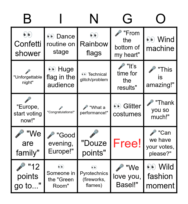 This bingo card has 25 words: π€ "Good evening, Europe!", π Pyrotechnics (fireworks, flames), π Technical glitch/problem, π€ "12 points go to...", π Wind machine, π Confetti shower, π€ "Unforgettable night", π Dance routine on stage, π Glitter costumes, π€ "Douze points", π€ "Itβs time for the results", π€ "Europe, start voting now!", Free!, π€ "Can we have your votes, please?", π Huge flag in the audience, π Wild fashion moment, π€ "Thank you so much!", π Rainbow flags, π€ "This is amazing!", π€ "Congratulations!", π€ "What a performance!", π Someone in the "Green Room", π€ "We are family", π€ "From the bottom of my heart" and π€ "We love you, Basel!".