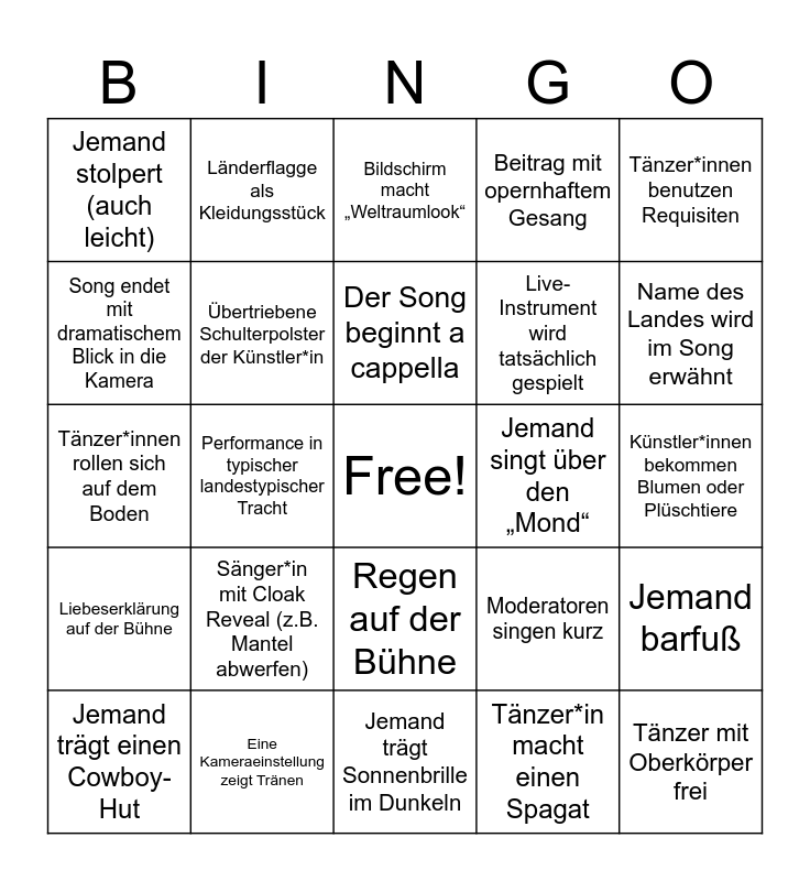 This bingo card has a free space and 24 words: Sänger*in mit Cloak Reveal (z.B. Mantel abwerfen), Eine Kameraeinstellung zeigt Tränen, Der Song beginnt a cappella, Jemand trägt einen Cowboy-Hut, Tänzer*innen benutzen Requisiten, Jemand stolpert (auch leicht), Song endet mit dramatischem Blick in die Kamera, Länderflagge als Kleidungsstück, Jemand singt über den „Mond“, Regen auf der Bühne, Live-Instrument wird tatsächlich gespielt, Tänzer*innen rollen sich auf dem Boden, Moderatoren singen kurz, Jemand barfuß, Übertriebene Schulterpolster der Künstler*in, Tänzer*in macht einen Spagat, Künstler*innen bekommen Blumen oder Plüschtiere, Bildschirm macht „Weltraumlook“, Name des Landes wird im Song erwähnt, Performance in typischer landestypischer Tracht, Tänzer mit Oberkörper frei, Liebeserklärung auf der Bühne, Beitrag mit opernhaftem Gesang and Jemand trägt Sonnenbrille im Dunkeln.